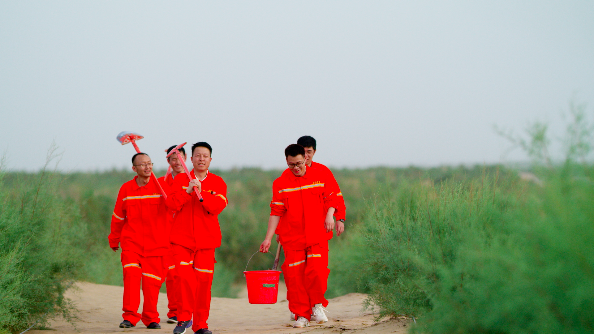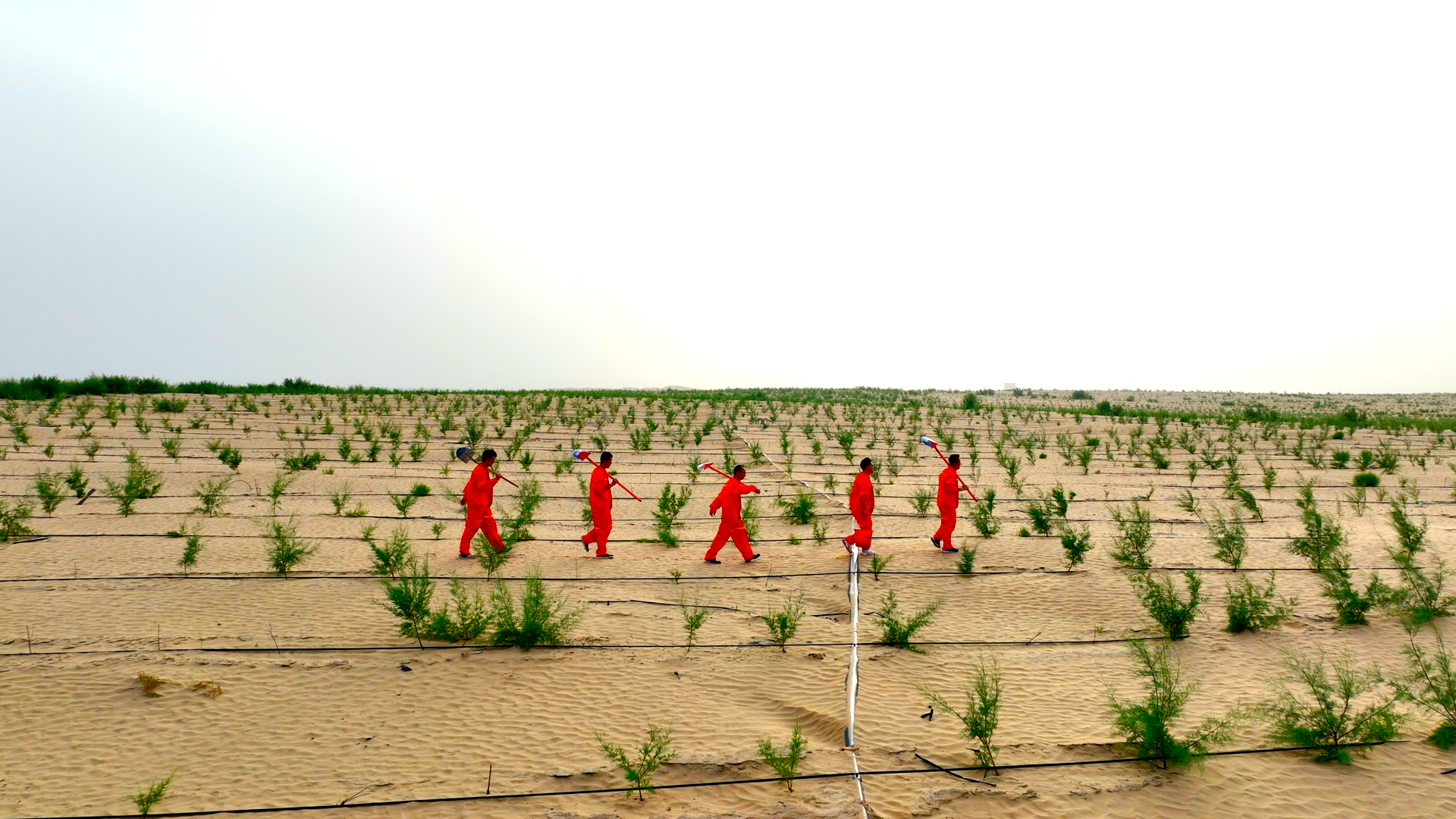 图为驻村工作队员带着工具行走在沙地上,每一步都在为沙漠增添生机与希望