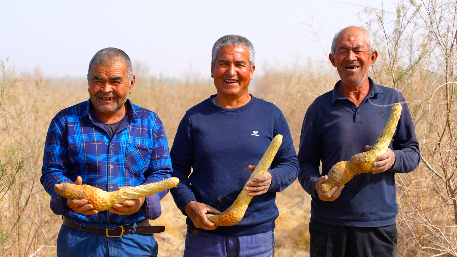 图为当地村民手捧肉苁蓉感受丰收的喜悦